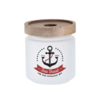 The jar comes with a durable wood lid that not only provides a secure seal but also adds a touch of warmth and natural beauty to the overall design. The lid helps to preserve the freshness and quality of the stored items while keeping them easily accessible.